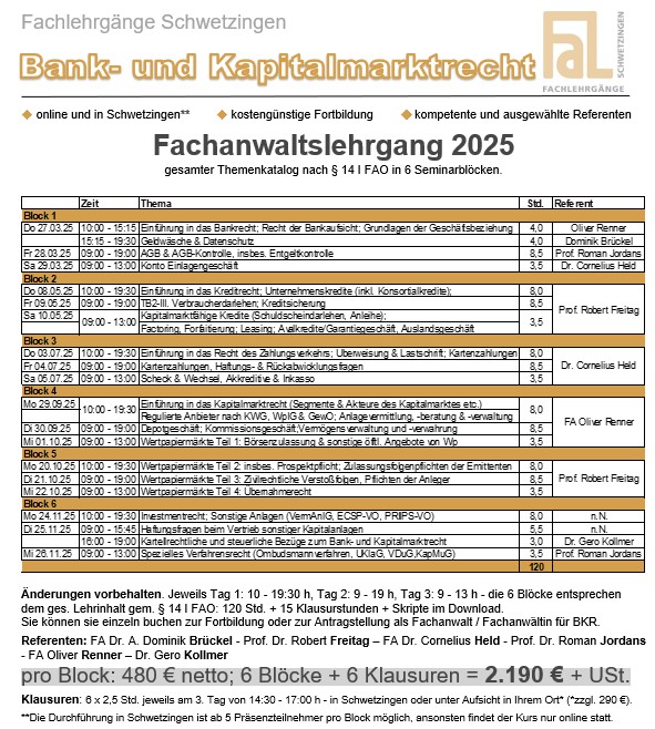 Thema: Fachanwaltslehrgang Bank- und Kapitalmarktrecht 2025